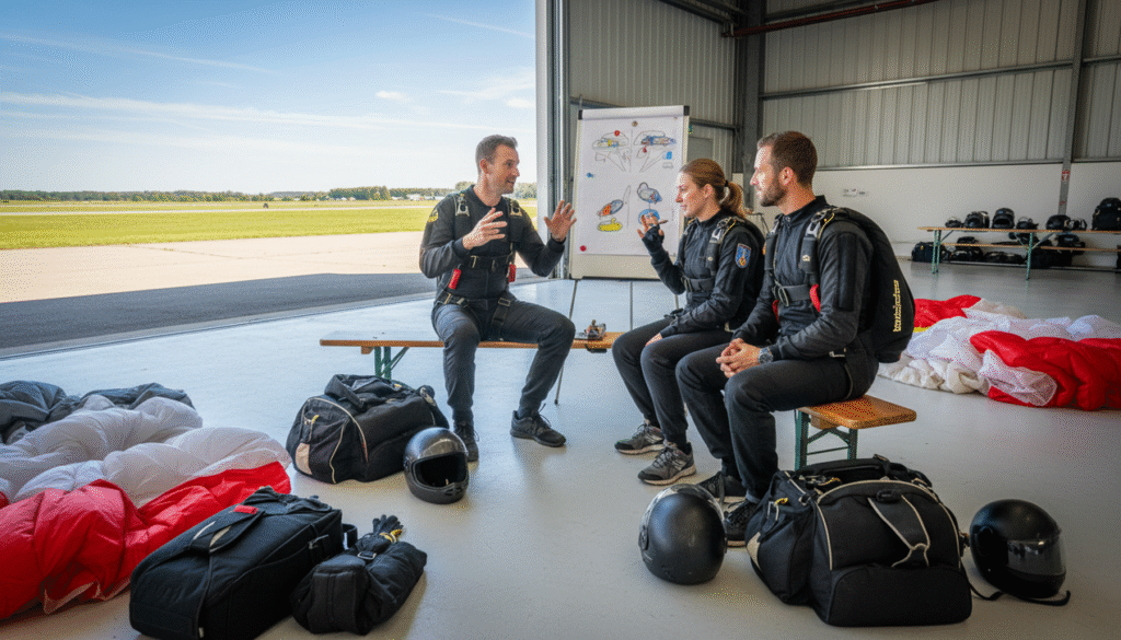 O curso AFF paraquedismo é estruturado em etapas práticas e objetivas. O primeiro momento é o briefing detalhado, onde o instrutor explica a sequência do salto, sinais manuais, procedimentos de segurança e comandos para o controle corporal durante a queda livre. Essa parte deve ser absorvida com máxima atenção, pois são as bases para a execução segura dos movimentos.