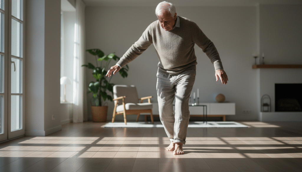 Caminhar na ponta dos pés é uma técnica simples que intensifica a resposta neuromuscular nos tornozelos e panturrilhas. Este exercício de equilíbrio para idosos promove maior sensibilidade do solo e ajuste do centro de gravidade. Para aplicar, caminhe 10 metros sobre as pontas dos pés, mantendo os passos lentos e controlados. Repita 3 vezes com intervalos curtos.